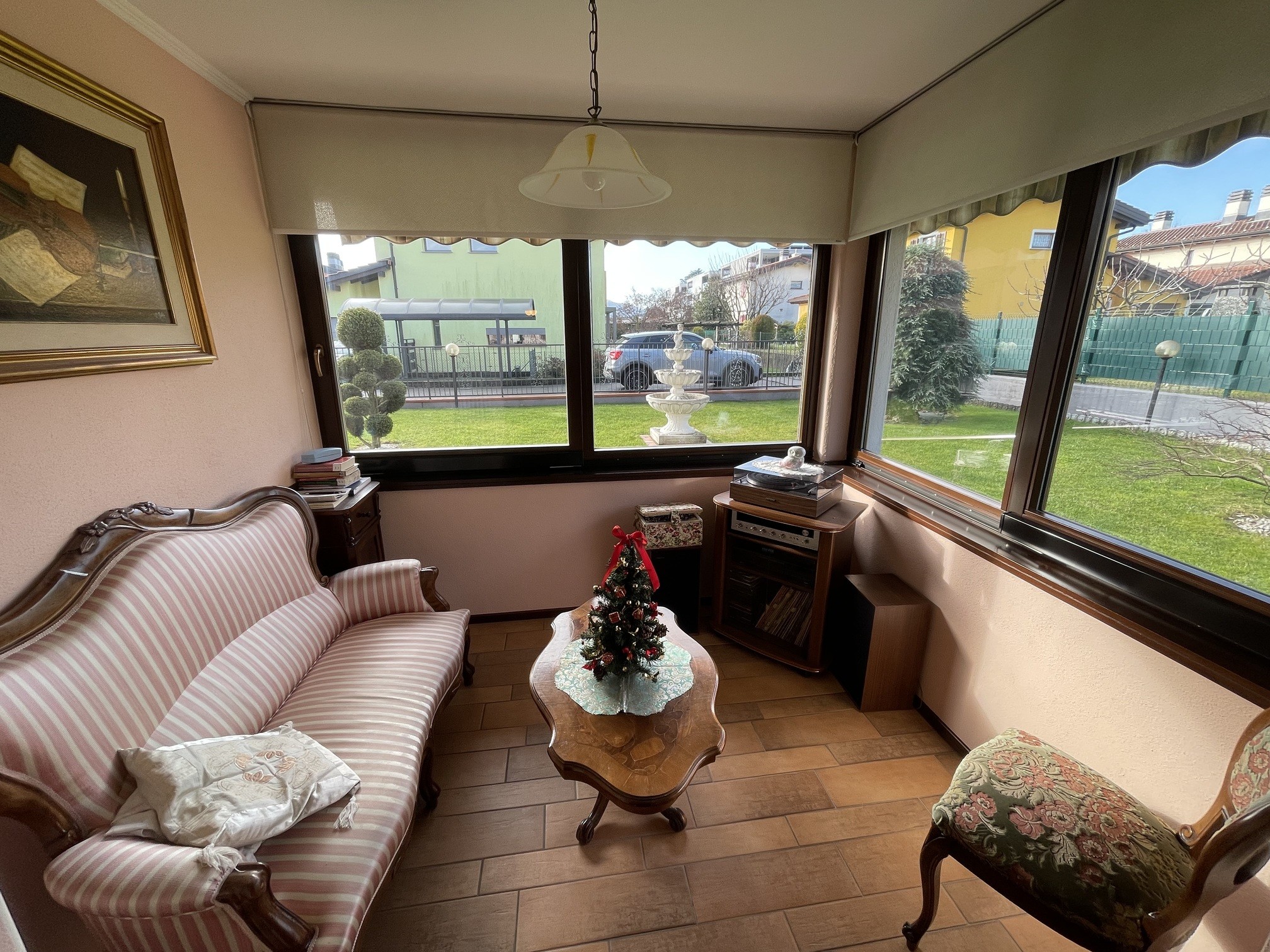 atrio d'ingresso, ampia zona soggiorno - pranzo con camino a legna, giardino d'inverno, cucina separata abitabile, bagno finestrato con doccia ed un comodo ripostiglio (mq lordi 90) oltre ad un grande garage doppio di ben 32 mq,