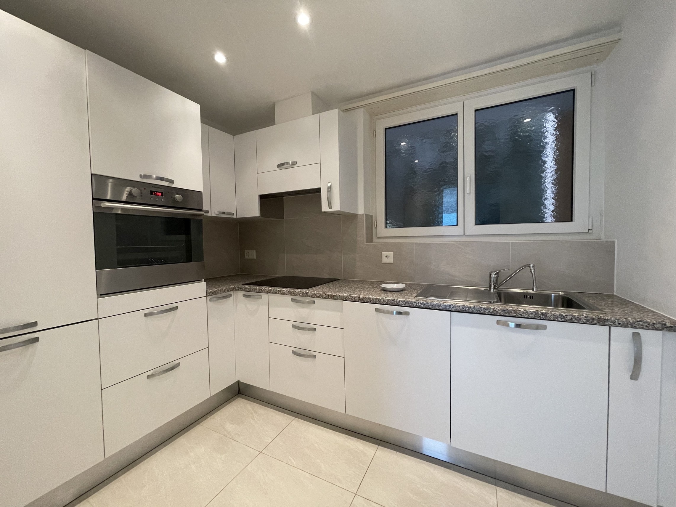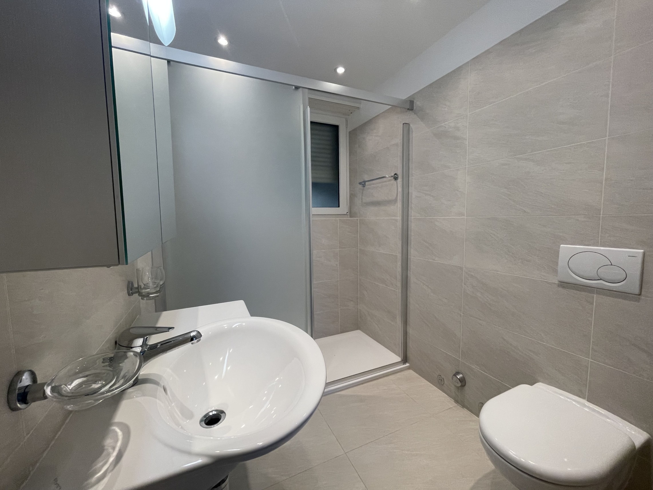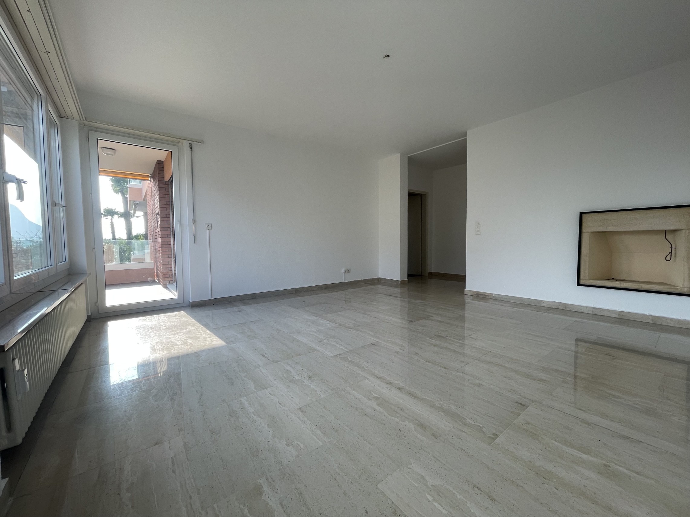 schöne, moderne, 2010 neu gestaltete separate Küche, ein fensterloses Badezimmer mit Dusche, ebenfalls 2010 neu gestaltet, ein kleines Zimmer, ein Doppelzimmer und ein helles Wohnzimmer mit Kamin (zu sanieren), von dem aus man einen wunderschönen Seeblick genießen kann und Zugang zur überdachten 8 m² großen Terrasse hat, die auf den gepflegten Gemeinschaftsgarten blickt. Bruttofläche 80 m².